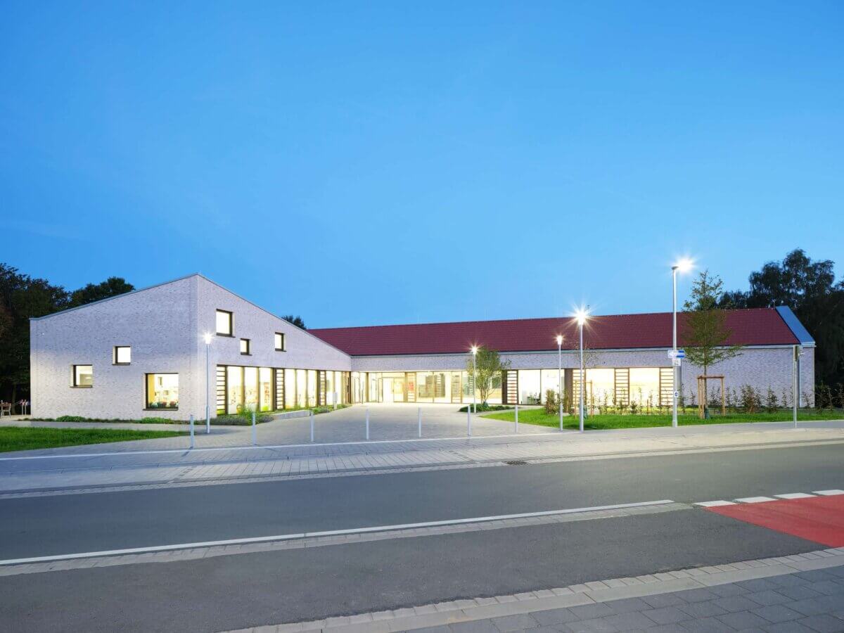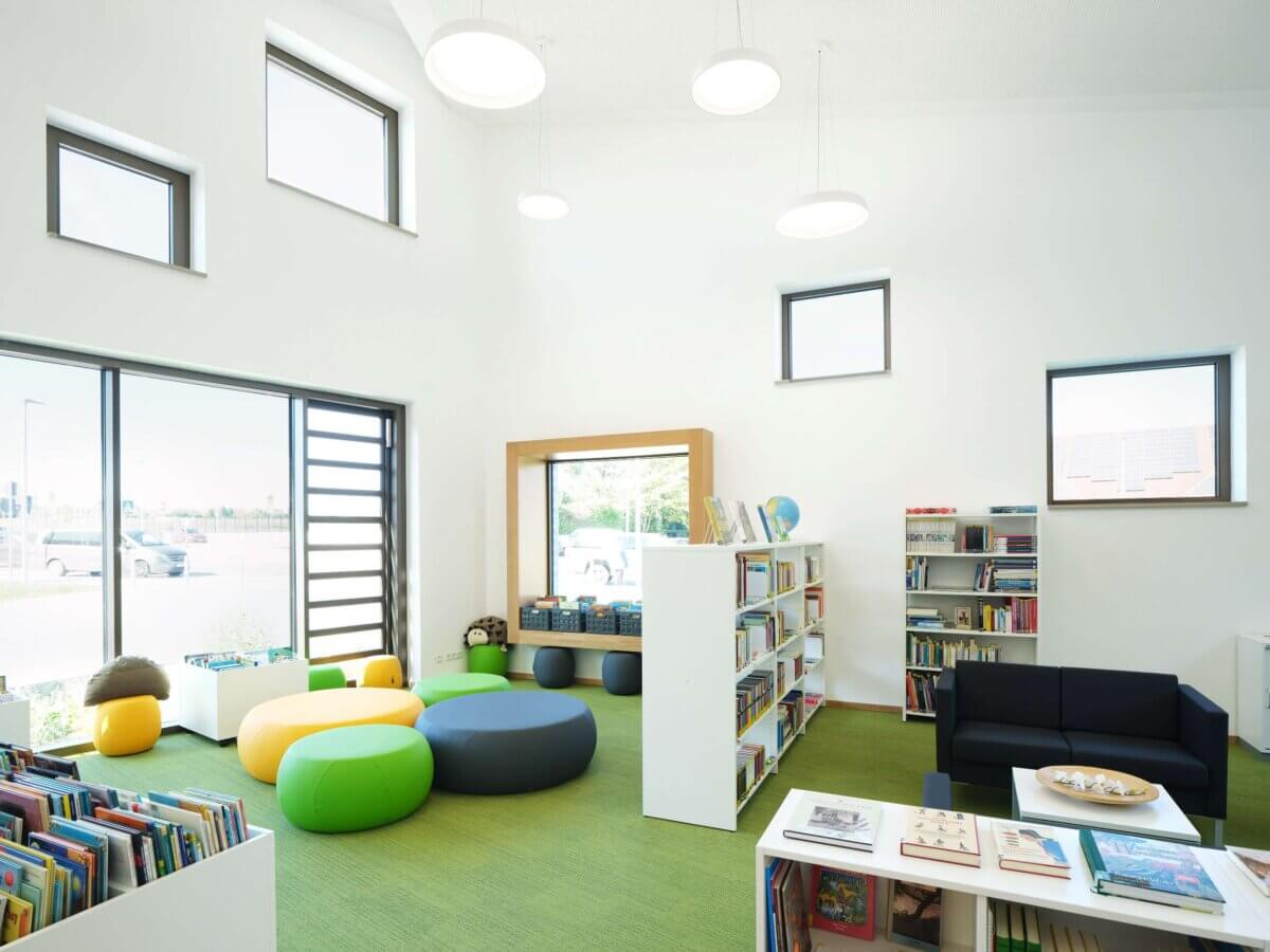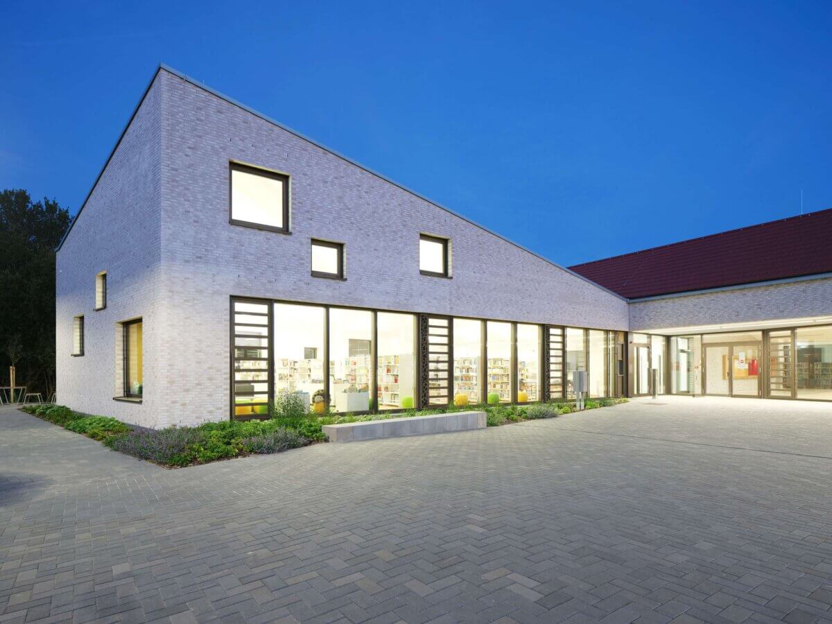 Bei der Entwicklung des neuen Gebäudekomplexes mit Schule, Einfeld-Sporthalle, offenem Ganztagsbereich und Gemeindebibliothek ist es ein besonderes Anliegen, das örtliche Erscheinungsbild mit seinem ländlich geprägten Charakter zu unterstreichen und eine städtbauliche Einbindung des Gebäudes in das bestehende Umfeld zu erreichen.