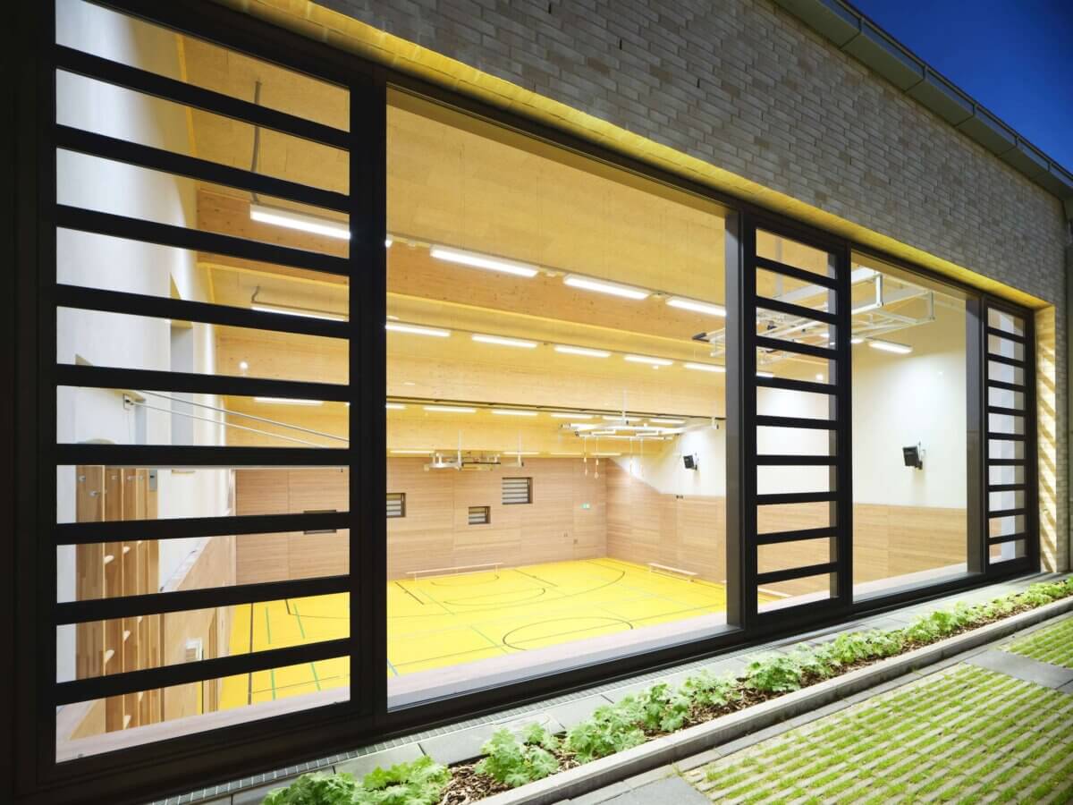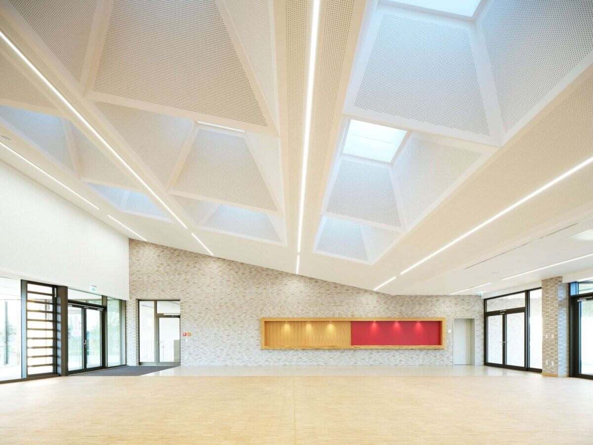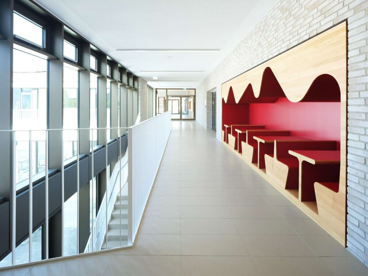 Hierdurch ergibt sich zur Ostseite hin eine lange Gebäudekante, welche in Form von mehreren Knicken auf die gegenüberliegende, vor- und zurückspringende Gebäudeform der Gesamtschule reagiert.