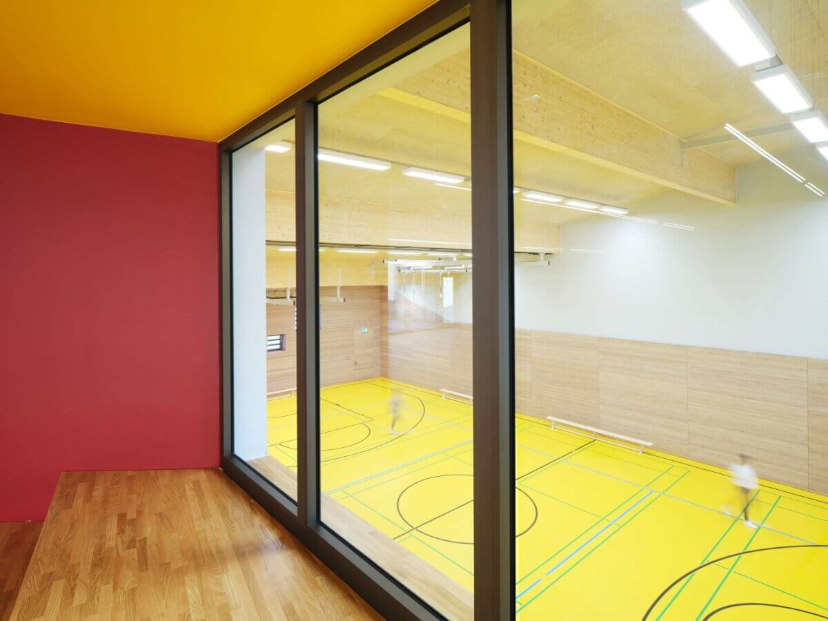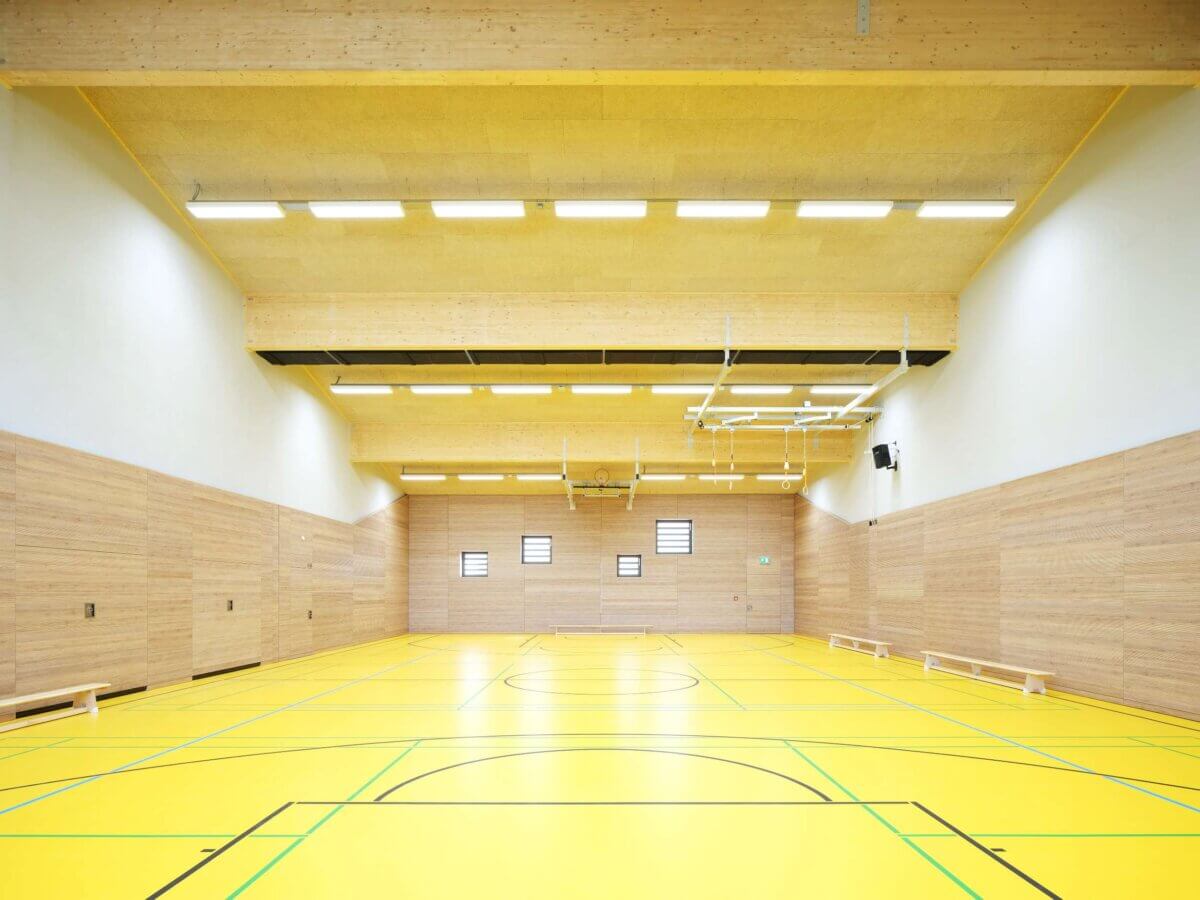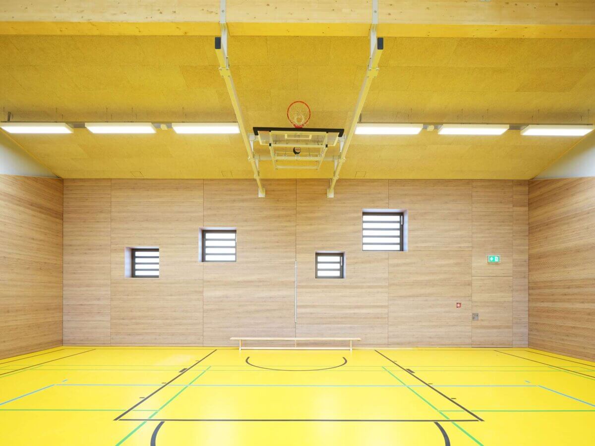 Somit werden die topographischen Gegebenheiten genutzt, indem die Sporthalle bis zur Hälfte im Boden eingegraben und das Gebäude auf ein bzw. zwei Vollgeschosse beschränkt wird. Daraus ergibt sich von der Straße zur Stertwelle ein dezentes, eingeschossiges Erscheinungsbild, welches mit einen ortstypischen Satteldach abgerundet wird.